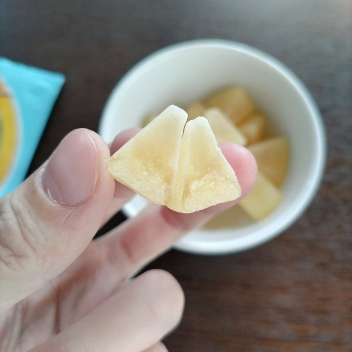 The small, firm pieces inside the gummy add a fun, fizzy sensation when you bite into them—an intentional play on texture and mouthfeel that’s become popular in Japanese confections.